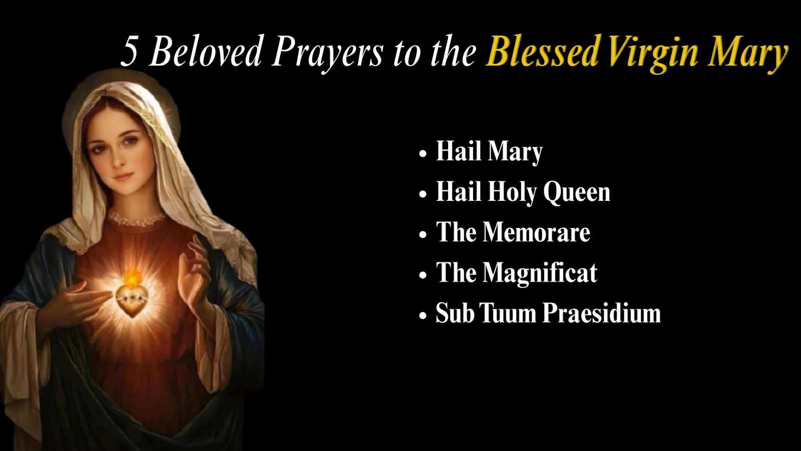 Discover five of the most beloved prayers to the Blessed Virgin Mary—Hail Mary, Hail Holy Queen, the Memorare, the Magnificat, and the Sub Tuum Praesidium. These timeless devotions offer comfort, hope, and powerful intercession in every season of life. Includes full prayers for you to pray today.